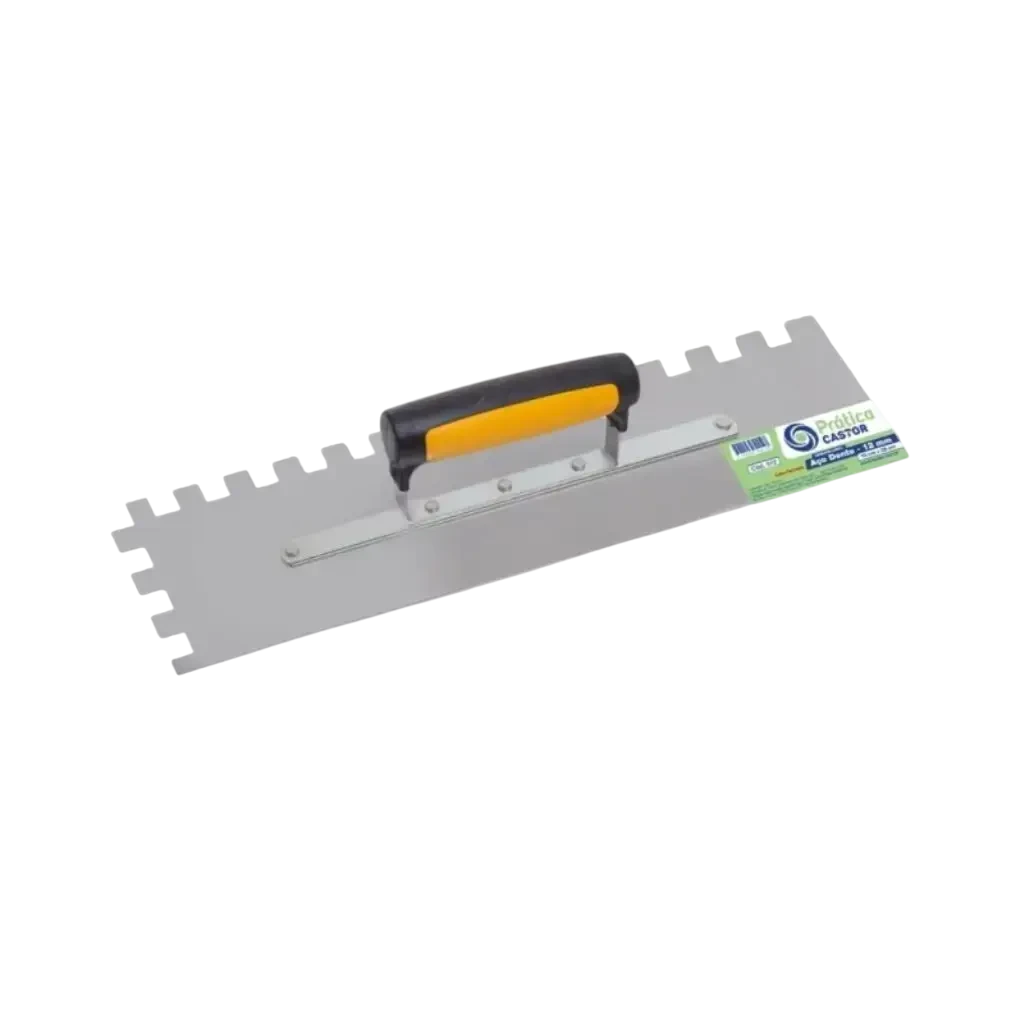 Desempenadeira de Aço Dentada Castor 12, ideal para aplicação de argamassa, pisos e revestimentos. Possui dentes quadrados de 12 mm e cabo plástico ergonômico, proporcionando conforto, precisão e excelente aderência do piso. Ferramenta resistente e leve, perfeita para profissionais da construção civil. Disponível na Efraim Materiais.